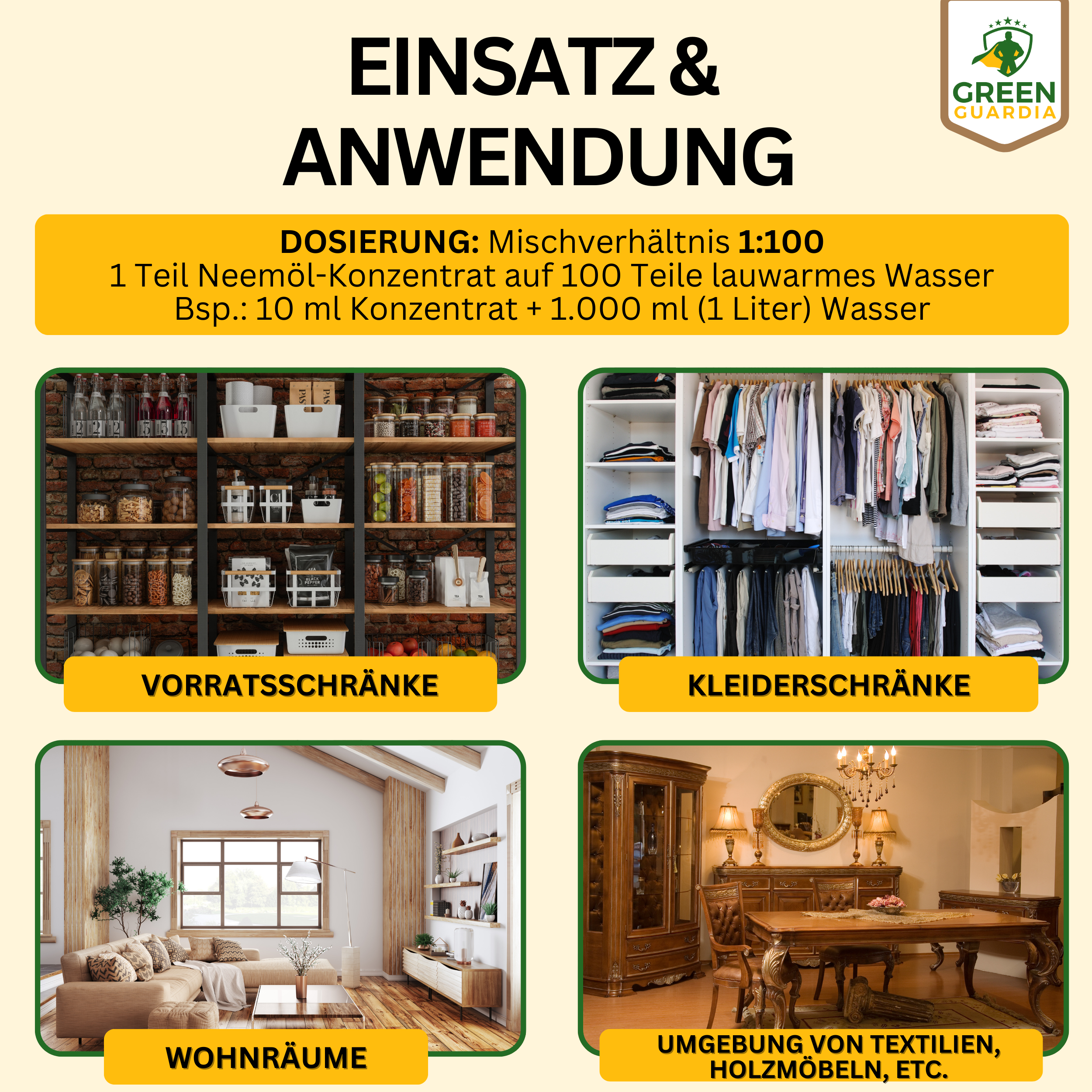 - VIELSEITIG EINSETZBAR: Ob Motten im Kleiderschrank, in der Küche oder in Vorratsbehältern – Neemöl bietet zuverlässigen Schutz vor Neubefall durch Kleidermotten und Lebensmittelmotten.