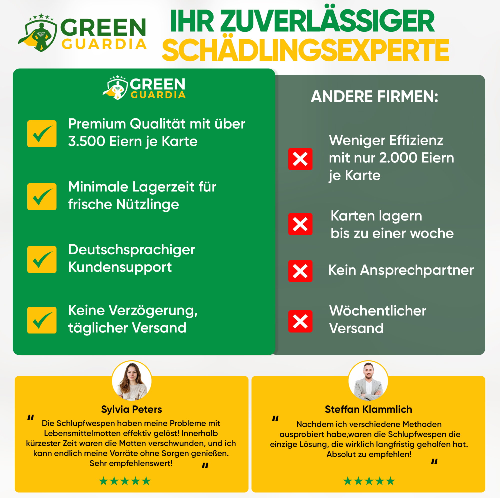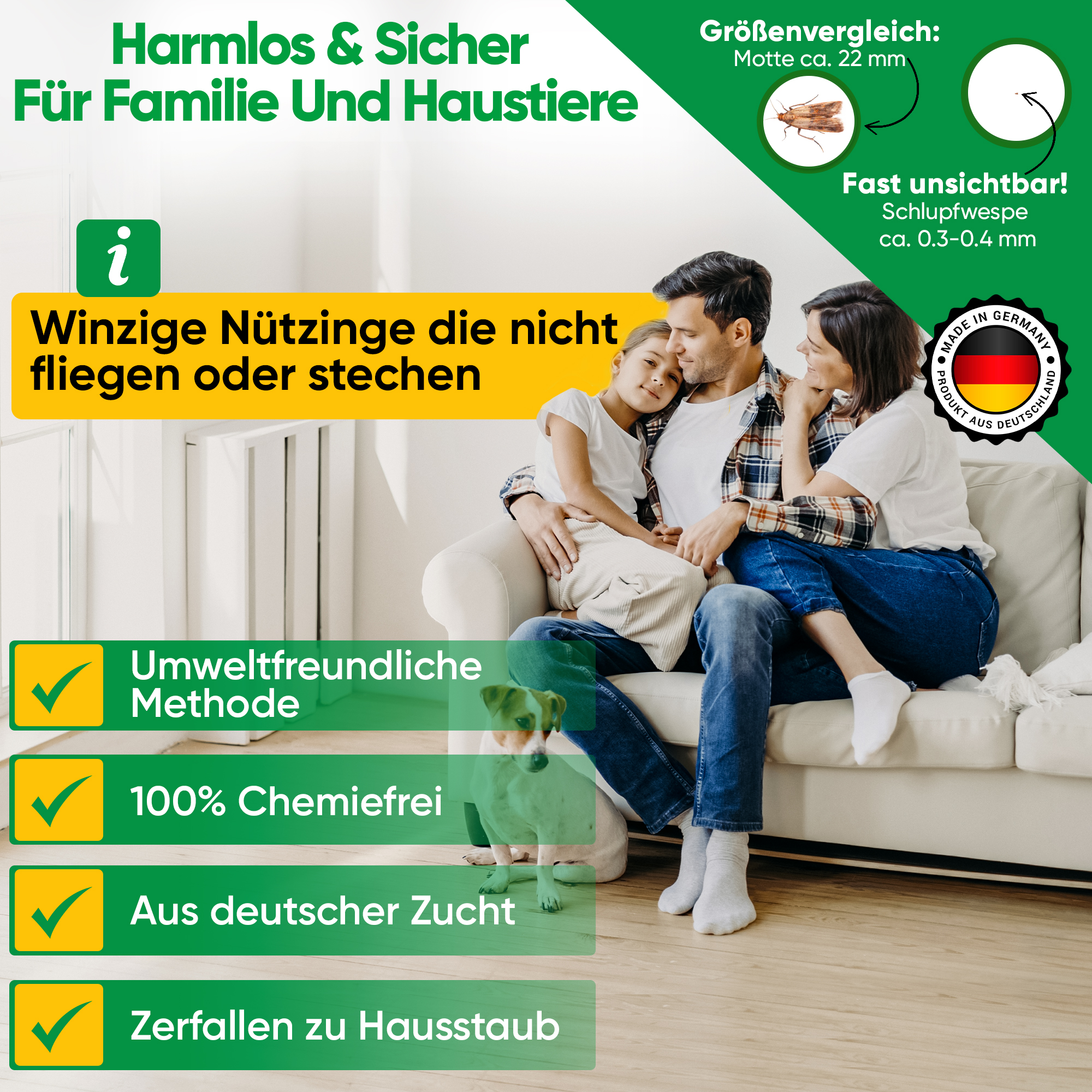 - DEUTSCHE QUALITÄTSZUCHT: Unsere Schlupfwespen werden wöchentlich frisch gezüchtet und sorgfältig gelagert, damit Sie sich immer auf eine einwandfreie Lieferung und wirksame Mittel gegen Motten verlassen können.