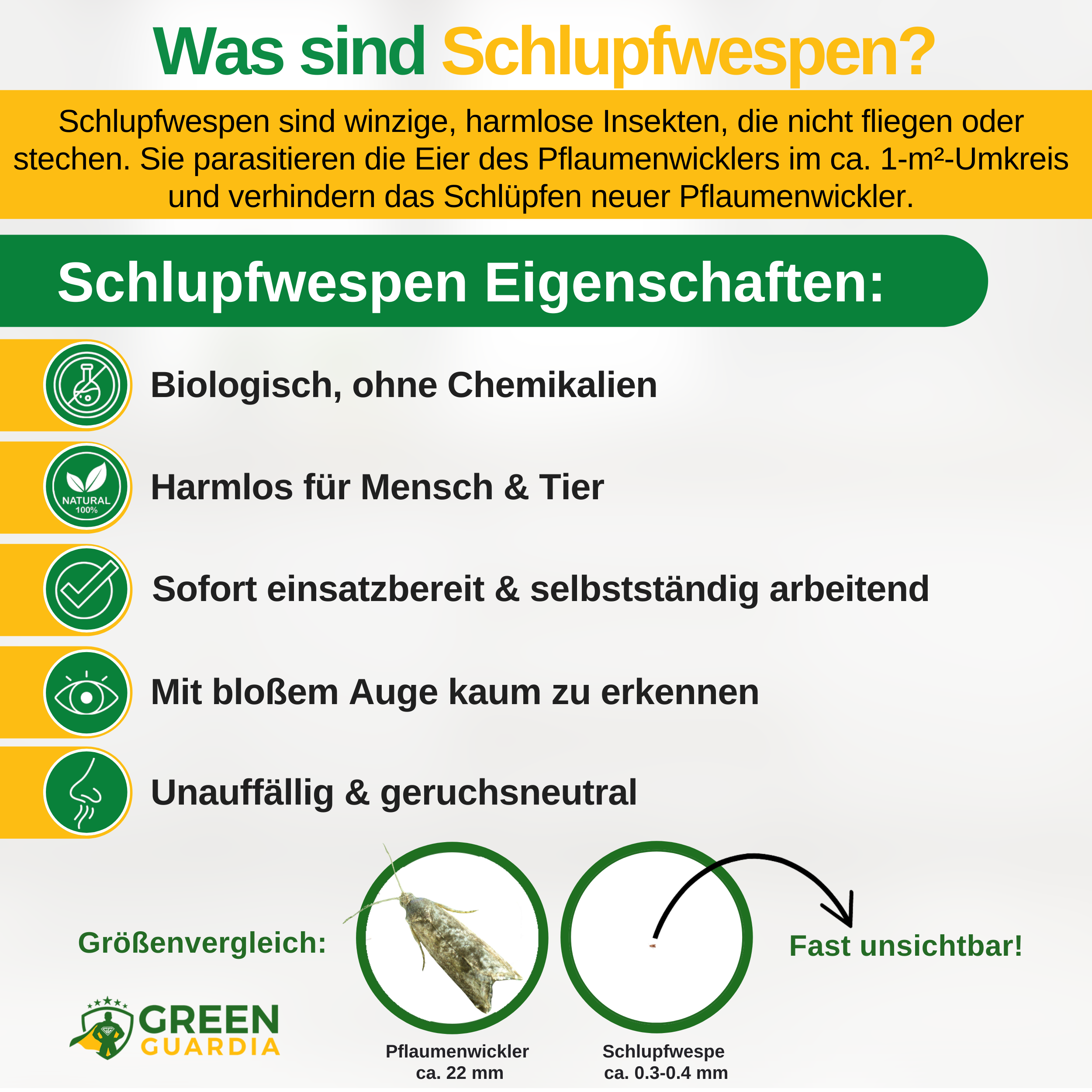 - SCHLUPFWESPEN GEGEN PFLAUMENWICKLER:Unsere Green Guardia Schlupfwespen bekämpfen Pflaumenwickler, indem sie die Eier des Schädlings parasitieren und dessen Entwicklungszyklus unterbrechen – 100% natürlich und chemiefrei.